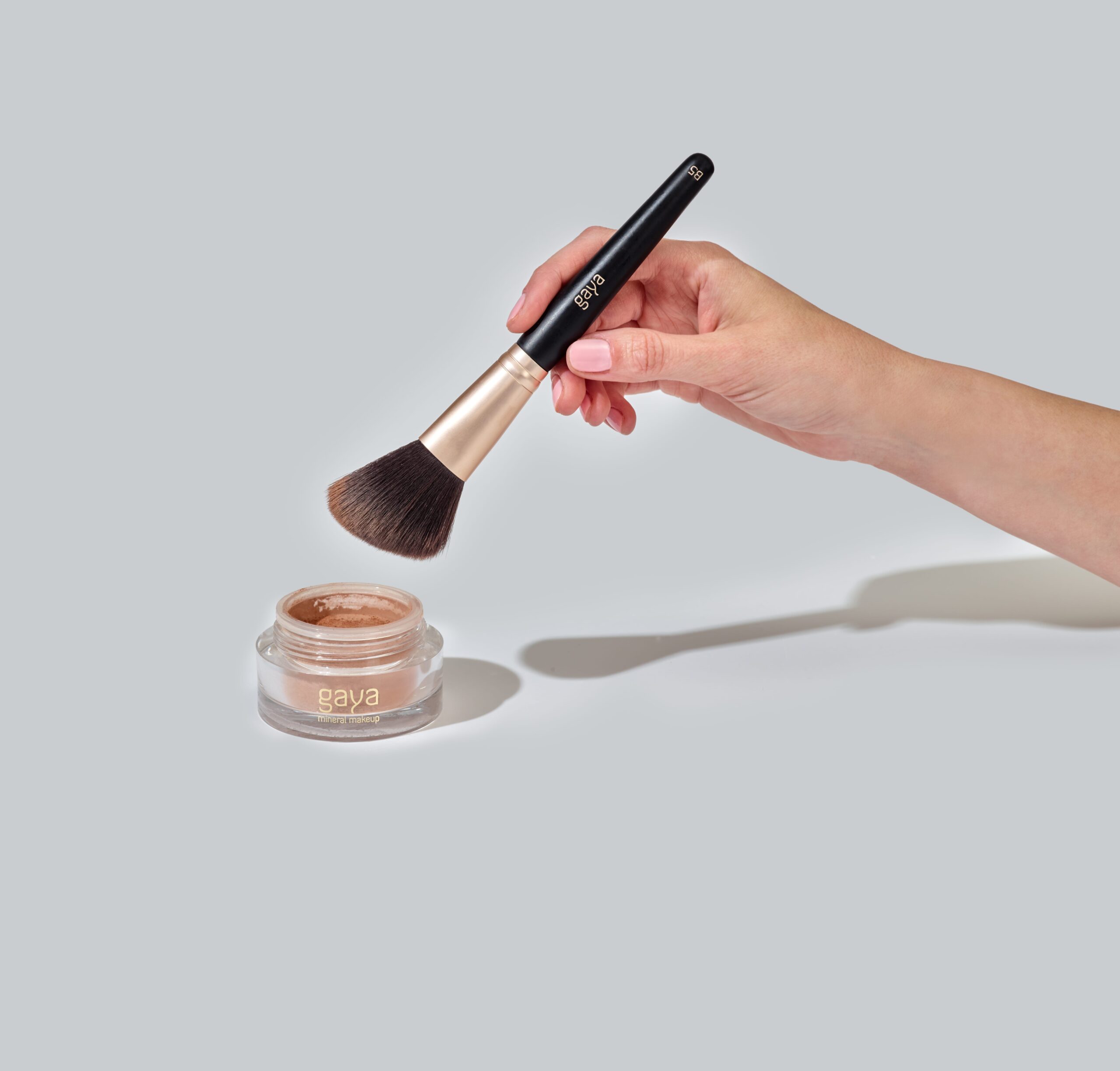 מברשת גדולה, רכה ומעוגלת היא המפתח להנחת ברונזר. היא מאפשרת פיזור אחיד של החומר מבלי ליצור קווים חדים או כתמים. כשהמברשת נטענת בחומר, טפחי אותה בעדינות על גב היד כדי להסיר שאריות עודפות—ברונזר נבנה בהדרגה, בשכבות דקות, אז אין סיבה להעמיס.